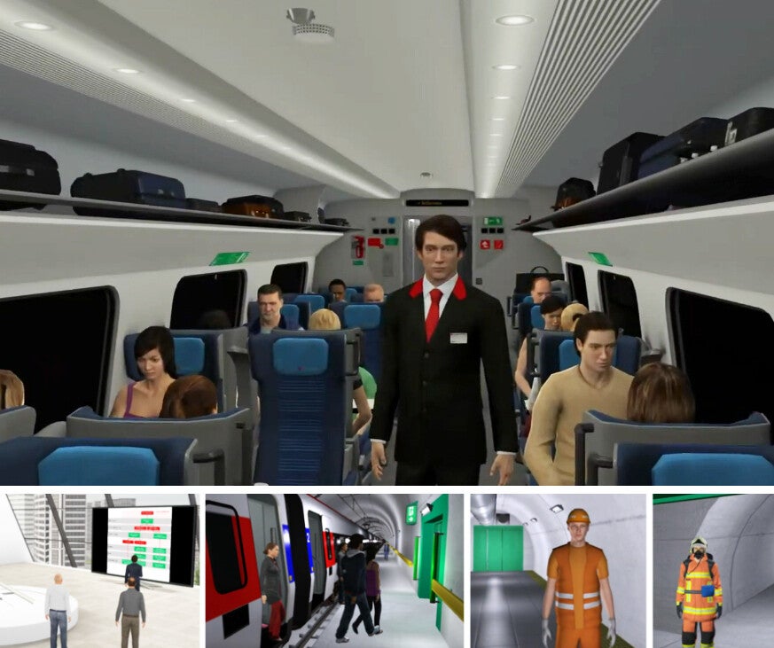 The scope of application ranges from learning route knowledge to emergency management strategies, such as those for fire emergencies, and simulated mass evacuations of entire trains. A complex scenario and sequence editor enables SBB trainers to develop training scenarios without requiring programming skills.